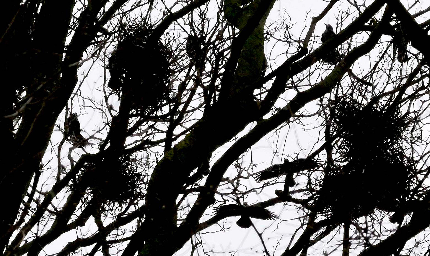 The rooks ride the gusts, sometimes settling into what sounds like conversational cawing, often rising as a raucous flock for no obvious reason. A few bring twigs to repair nests, others seem to be here just to be sociable.